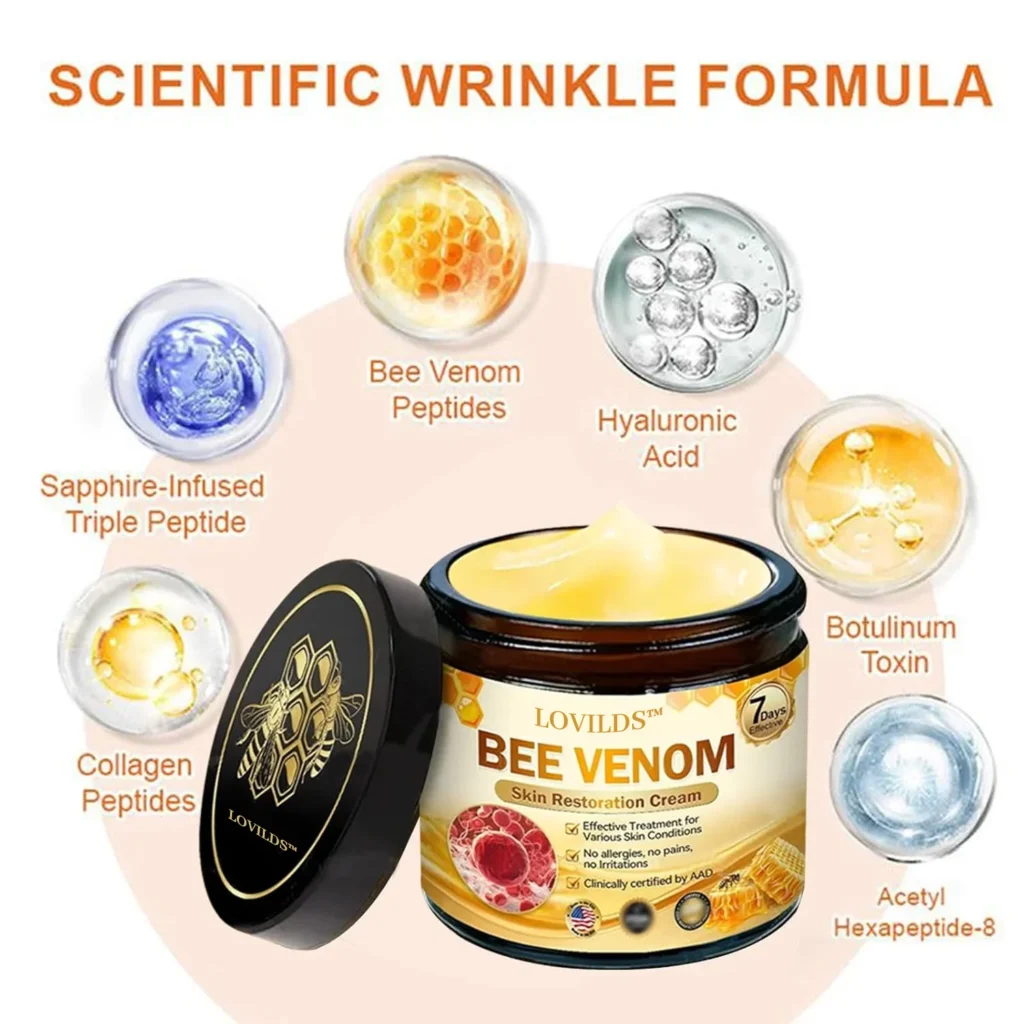 LOVILDSĀ® Bee Venom Skin Restoration Cream uses bee venom peptides to mimic the effects of Botox, relaxing facial muscles and reducing the formation of expression lines. At the same time, hyaluronic acid deeply hydrates the skin, making it plump and effectively smoothing fine lines and wrinkles. The combination of Acetyl Hexapeptide-8 and botulinum toxin targets deep wrinkles like forehead lines and crowās feet, leaving your skin looking firmer and smoother.
