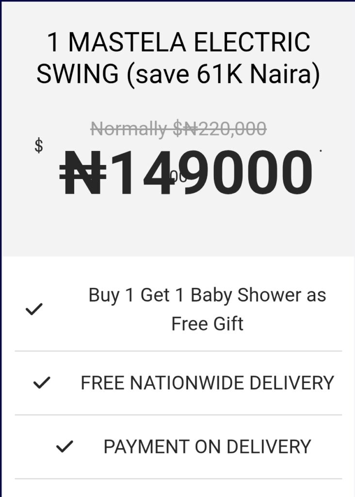 ChiomaFrom LagosThe Mastela 3in1 Baby Swing is a game-changer. Its thoughtful design provides unmatched comfort while ensuring top-notch safety. My baby seems to drift off into a peaceful sleep every time, thanks to the gentle, natural motion. The ease of use and reliability of this swing have taken the stress out of our busy days—truly a mindblowing experience!